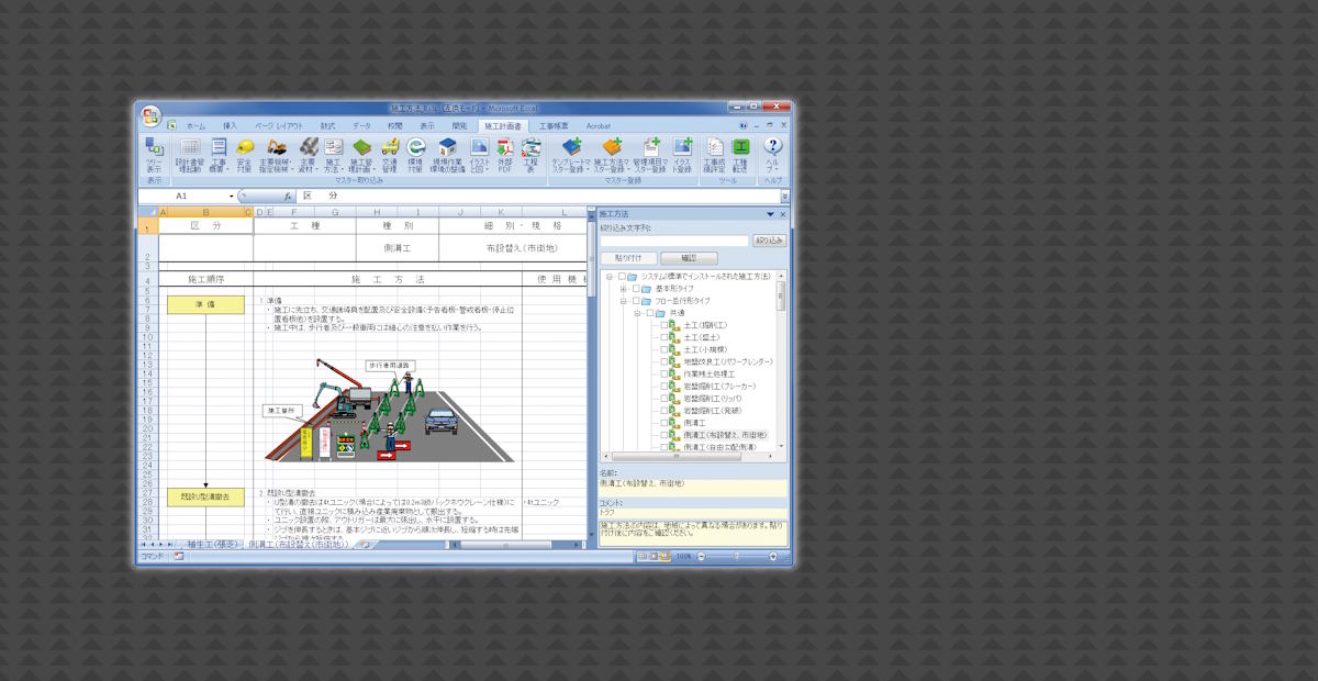 勝ち残る施工計画書 施工計画書作成支援システムとは? 施工計画書作成支援システムは、使い慣れたExcelを施工計画書専用ツールとして活用できるExcelアドインです。 現場経験に基づいた200工種以上の施工方法例を標準搭...